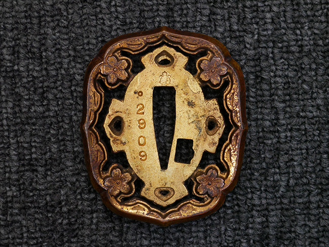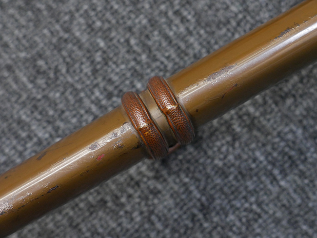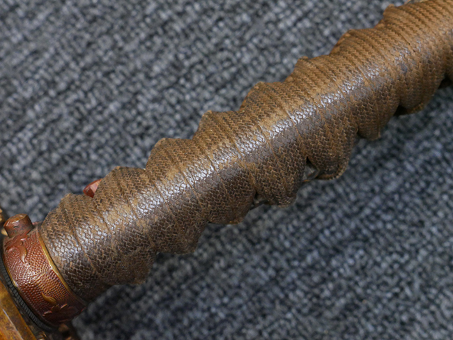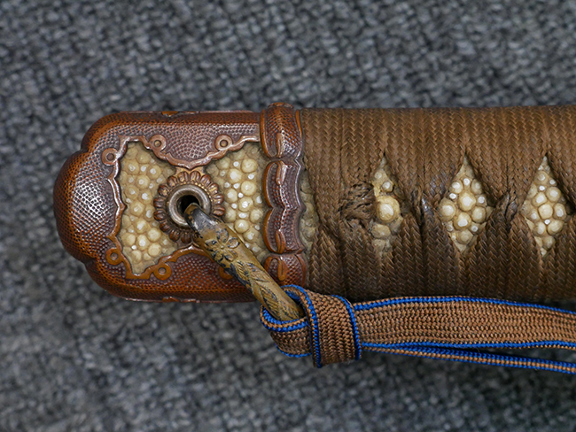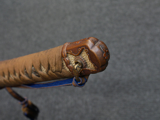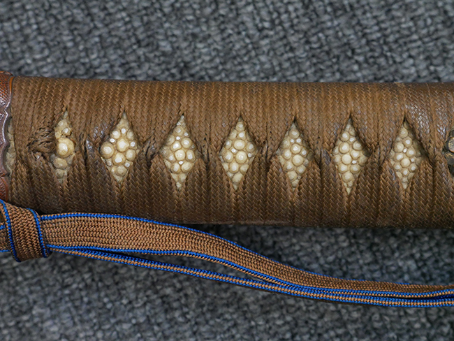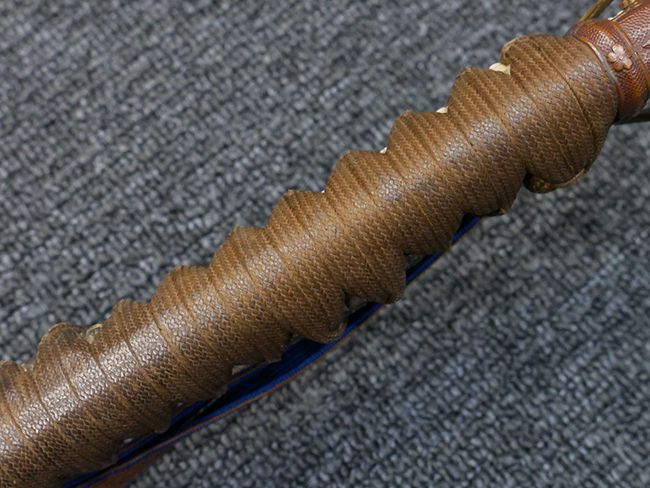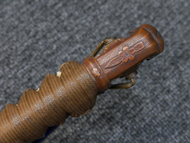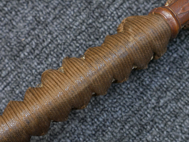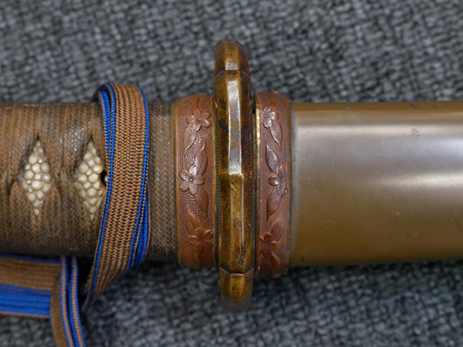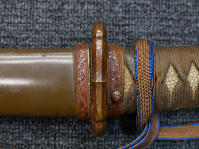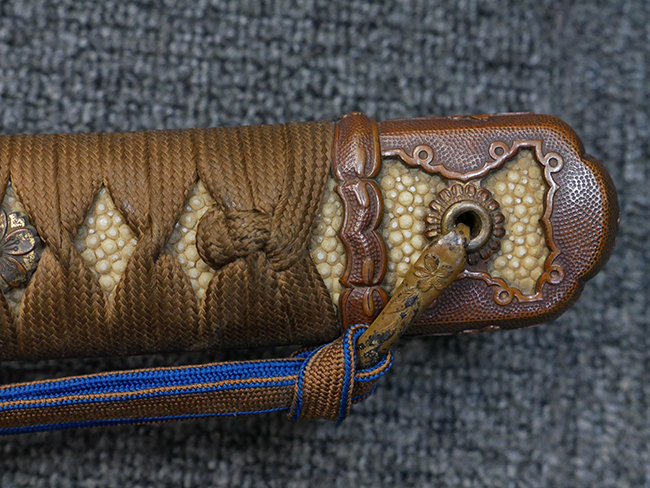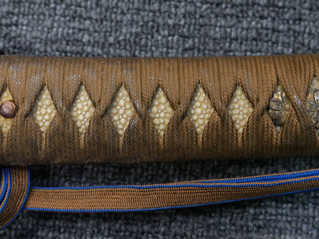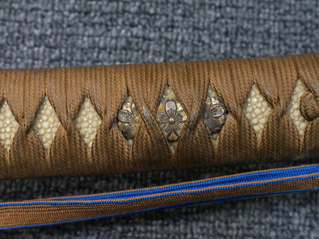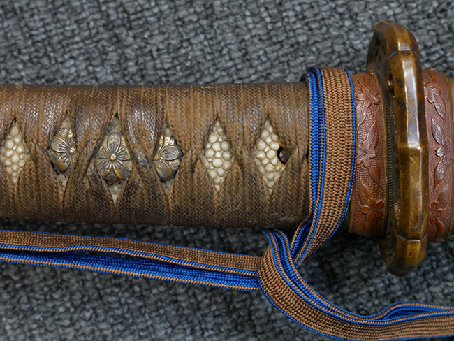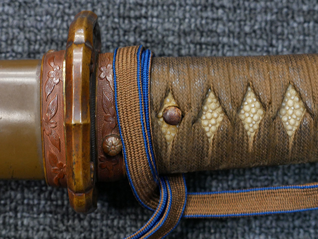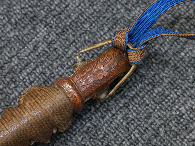 切羽は大切羽2枚、小刻2枚となっています。 鍔と各切羽には通し番号2909が打たれている揃いの品です。 また、鍔には東京にあった株式会社壽屋刀剣商店を示すハープと壽を組み合わせた刻印が打たれています。 駐爪は真鍮製茶褐色塗装で、動きはスムーズで発条のテンションもしっかり残っています。 ロックもしっかりと掛かります。 駐爪と縁金具にも2909の刻印が入っています。 柄は大きな親粒付の本白鮫革が使用されています。 柄巻は適度な使用感が見られ、若干の汚れがあるものの切れや破損は見られず、概ね良好な状態が保たれています。 猿手は桜花模様の金属製です。 柄の縁金具が収まる木部にも二九〇九の書き込みが見られます。
