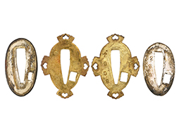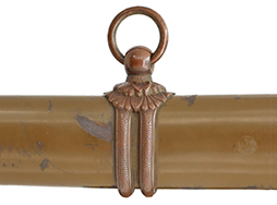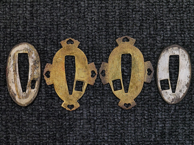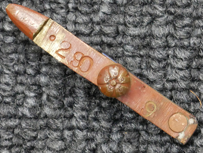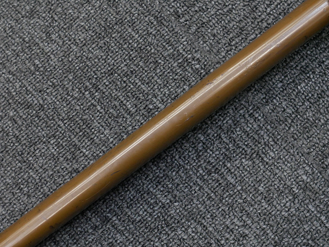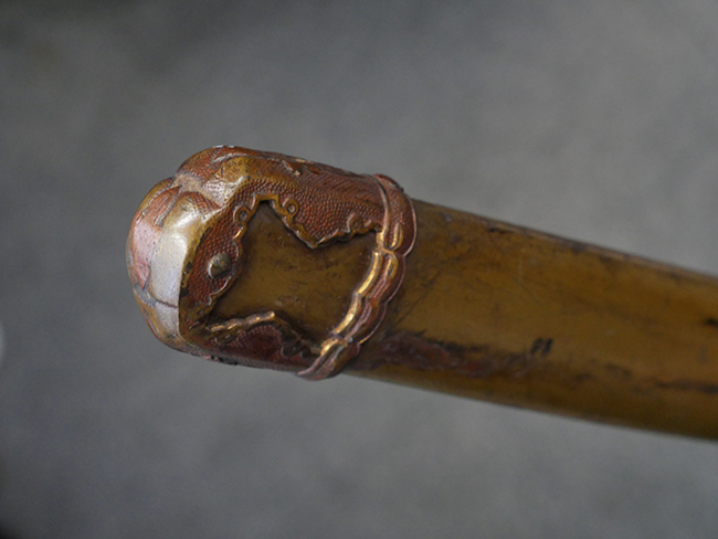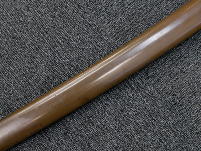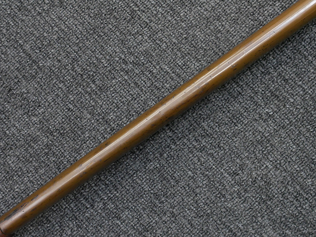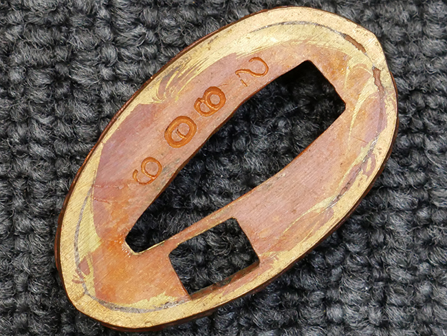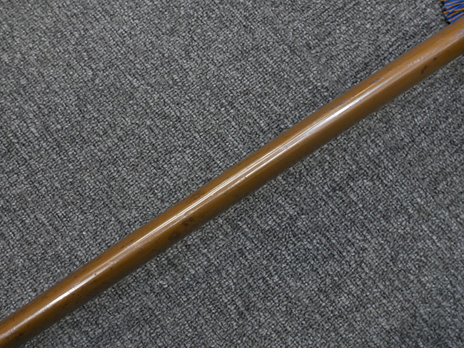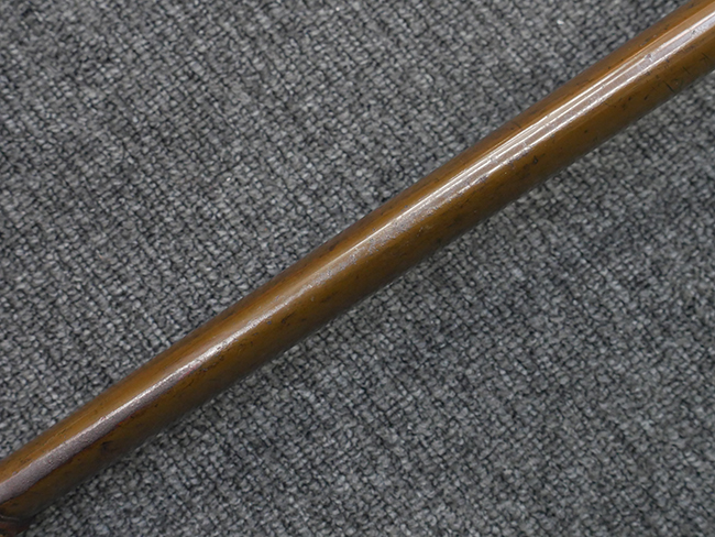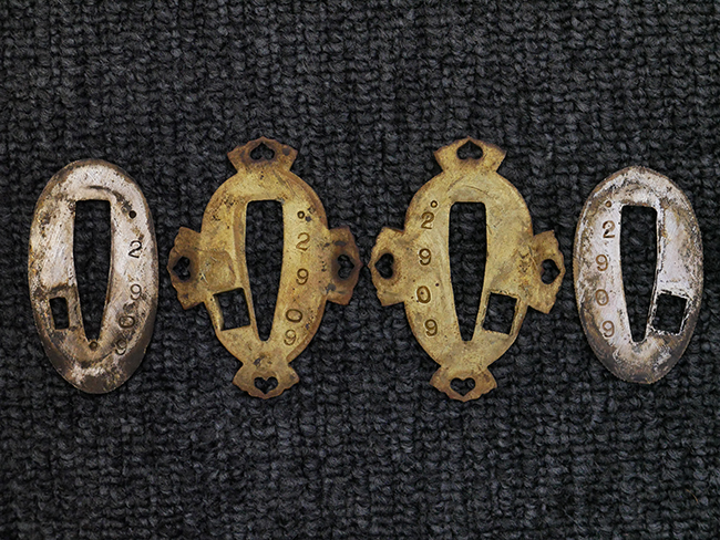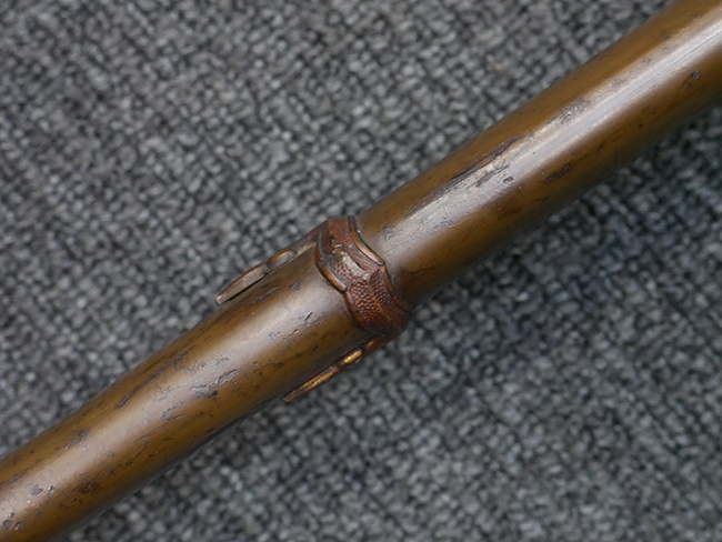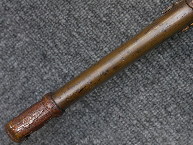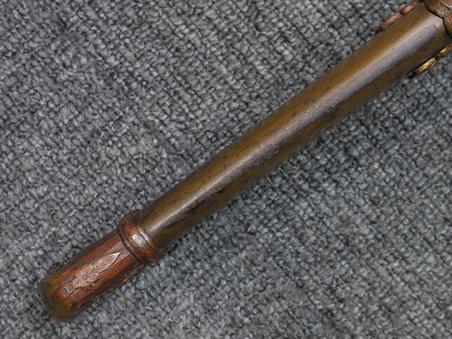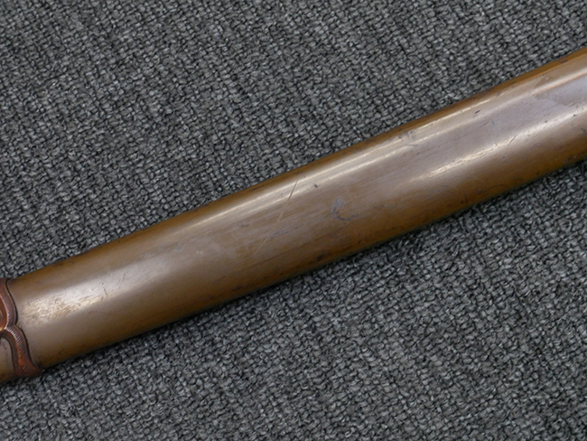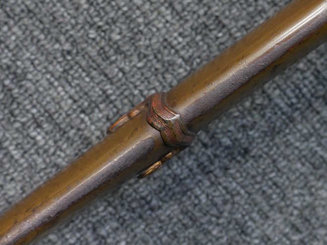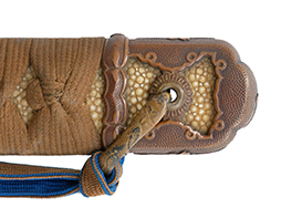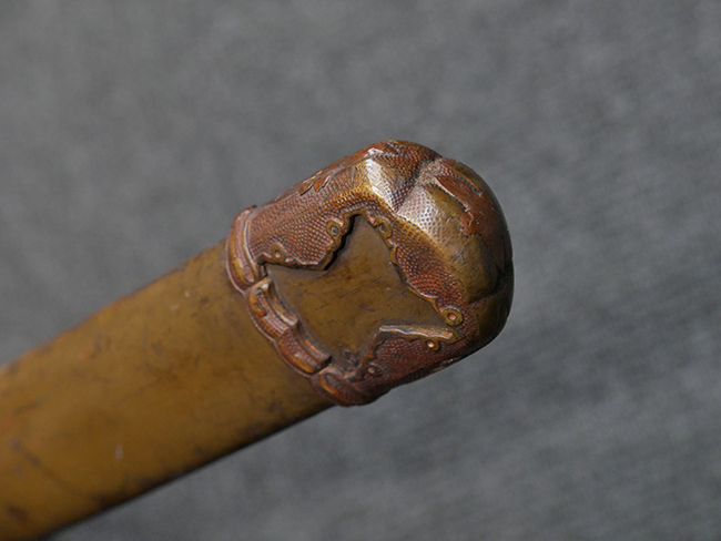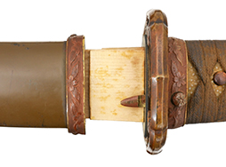 切羽は大切羽2枚、小刻2枚となっています。 鍔と各切羽には通し番号2909が打たれている揃いの品です。 また、鍔には東京にあった株式会社壽屋刀剣商店を示すハープと壽を組み合わせた刻印が打たれています。 駐爪は真鍮製茶褐色塗装で、動きはスムーズで発条のテンションもしっかり残っています。 ロックもしっかりと掛かります。 駐爪と縁金具にも2909の刻印が入っています。 柄は大きな親粒付の本白鮫革が使用されています。 柄巻は適度な使用感が見られ、若干の汚れがあるものの切れや破損は見られず、概ね良好な状態が保たれています。 猿手は桜花模様の金属製です。 柄の縁金具が収まる木部にも二九〇九の書き込みが見られます。