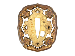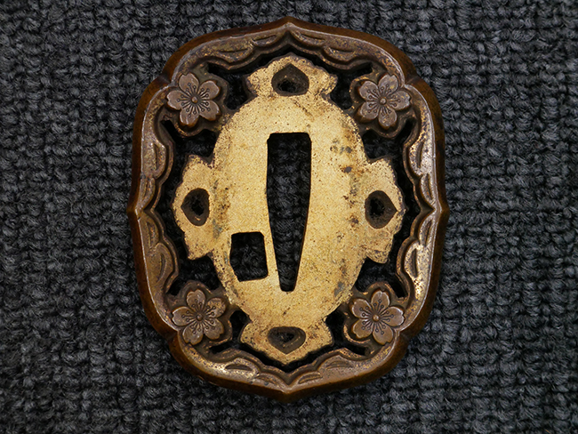 陸軍九八式軍刀の拵えです。 鍔は桜花透かしの入った高級感のある初期の仕様で、外周(耳)部分には茶褐色塗装が施されています。