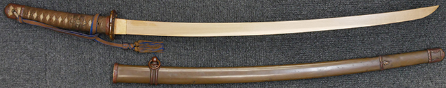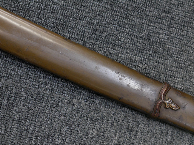 外装全長約100.9cm、柄全長約24.1cm、木製刀身(つなぎ)付。(TK)