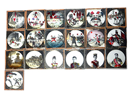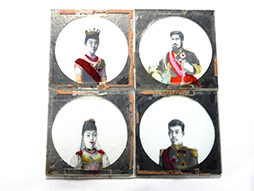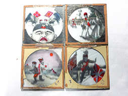 2枚のガラス板を合わせた造りで縦横約60mm、厚みは約4mmほどです。 明治天皇や大正天皇や皇后のものが4枚、日露戦争系のものが13枚(その内10枚ほどはビゴーのような風刺画風となっています)、風景が2枚となっています