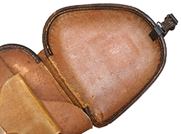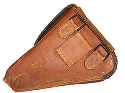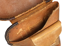 - アイテム説明十四年式拳銃のホルスター (拳銃嚢)です。 末期のゴム引きキャンバス製で、全体的に経年に伴う硬化が見られます。 斜革は付属しません。 一部縫い目の解れや縁部分に折り返して貼りつけられた補強革に剥落が見られますが、大部分に補強革が残った状態です。 フラップ基部の縫い目の解れや一部に革の切れが見られるため、開閉操作には僅かに注意が必要です。 フラップ裏面には陸軍名古屋造兵廠の「名」のスタンプが薄っすらと確認できます。 留め金具の発条テンションは健在ですが、ホルスター自体に若干の型崩れが見られるため、 留め具のロックが掛からない状態になっています。 予備弾入れの蓋は硬化に伴い開閉が難しくなっています。 背面の斜革取り付け環には大きな錆や腐食も見られません。 (TK)