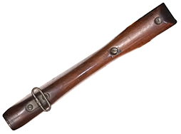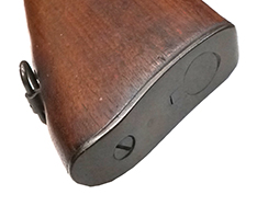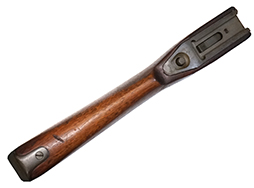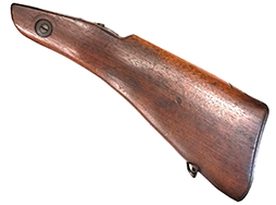 - アイテム説明トンプソンM1928に使用されるバット・ストックです。 金具やネジは揃っています。 木部は角部を中心に若干の摩耗や打ち傷が見られますが、大きな割れや欠けは見られず、表面に艶のあるしっかりとした状態が保たれています。 ストック右面の割れ止めディスク付近に「AA」の打刻が見られます。 金具はパーカー仕上げで、バット・プレートに薄っすらと表面錆痕が見られるののその他大きな腐食等は見られません。 バット・プレートとストックの取り付けに隙間は見られません。 また、リア・スイベルはプレス型となっています。 レシーバー・ロック・ボタンのテンションも健在で、ストック・コンパートメントの蓋の開閉にも問題はありません。 (TK)