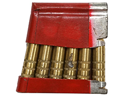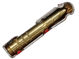 シュミットルビン K11等で使用する擬製弾とクリップのセットです。擬製弾は真鍮無垢の削り出しで、雷管や火薬等の一切入っていない安全品です。 擬製弾にはやや経年に伴うくすみやシミが見られますが、弾頭部含め大きな傷や破損はありません。 赤い塗装の施されたクリップも若干の小傷が見られますが目立った破損はなく、しっかりと機能しています。 (TK)