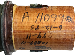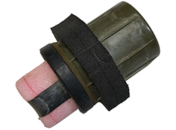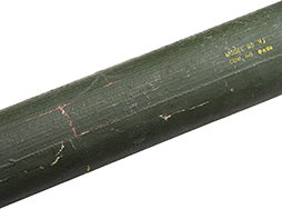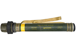 本体には 「HIGH EXPLOSIVE WARHEAD」や注意書きのステンシルが見られることから、多目的榴弾(HEDP)のコンテナと思われます。 その他、ランチャー本体との接続部には「12889-11 89-11 6-12-85 A71099」の書き込みと検印と見られるスタンプが見られます。 本体には保管や運搬の際に付いたと思われる傷や、塗膜にひび割れが見られますが、現状大部分で塗装が残った状態が保たれています。 弾頭側の蓋に取り付けられたスポンジ製緩衝材も傷みは少なく、しっかりとした状態です。 蓋部分に破損は見られず、しっかりねじ込んで固定することが可能です。 弾底側の蓋はゴム製のキャップが取り付けられています。 本体に固定されているナイロン製スリングにも解れや破れと言った破損は見られません。 本品は使用済みのコンテナ部分のみで、内部に火薬等の一切入っていない安全品です。 (TK)- 詳細画像