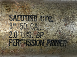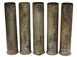 本品は戦後に生産・使用されたMk9 Mod 0(鉄薬莢)です。 薬莢長が通常の.50口径3インチ砲弾より短い(約45.7cm)点、側面に「SALUTING」の記載が見られる点から、式典等に使用される礼砲(Salute Gun)の空砲薬莢と分かります。 各薬莢の薬莢底部には「3IN MK 9 MOD O 50CAL」の刻印が共通して見られます。 その他のロットNo.などの刻印は個体によって異なり、一部の個体は錆により打刻内容が不詳な箇所が見られます。 また、薬莢側面には「3"/50 CAL. 2.0LBS PERCUSSION PRIMER」のプリントが見られ、一部の個体には1955~74年まで使用された米国連邦政府補給品ナンバー(FSN)の記載も見られます。 側面のプリントは個体によって掠れている状態です。 薬莢には経年に伴う錆や凹みが散見され、薬莢の口部分の変形やリムの破損が見られます。 雷管に打撃痕のある、発火済みの火管が残った、内部に火薬等の入っていない安全品です。 程度の良いものから販売いたします。 薬莢全長:約45.7cm、最大直径:約11cm、重量:約2.5kg。 (TK)