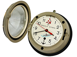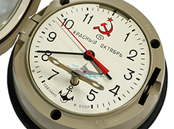 - アイテム説明ソ連海軍 5-2ChM 艦内壁掛時計です。 文字盤の直径:約17cm、高さ:約10cm、重量:約2.8kgです。 ボストーク製で、文字盤には鎌とハンマー、ボストーク社のロゴ、「KRASNYI OKTIaBR’(クラスヌィ・オクチャブリ=赤い十月)」、潜水艦のイラストと錨マーク、ソ連製を示す「SDELANO V SSSR」の文字が確認出来ます。 本品はゼンマイ式で、付属のキーを側面に差し込み時計方向に回すと文字盤にアクセスが可能です。 文字盤の6時方向にある穴にキーを差し込んで巻くことで設計上は約6日間稼働することが出来ます。 本体裏面の黒プラスチック製カバーを取り外した面には「01883/1 0000 Made in Russia SOVIETSKI」の刻印が見られます。 時計本体裏面の壁掛け穴の上側2箇所には破損が見られます。 時計本体外装やガラス面には細かな擦れこそ見られますが、大きな傷や破損は見られません。 動作テストとして3日間稼働させた結果、1分程度の誤差が見られました。 巻き上げ用キー2つ、マニュアルが付属します。 マニュアルはロシア語と英語で併記されていることからソ連崩壊後の海外向け輸出仕様と思われます。 マニュアルには各スペックや工場検印、本体とマッチした01883のシリアルNo.の記載が見られます。 現状問題なく作動していますが、古い機械物のため確実な動作、機能的な保障はいたしかねます。 (TK)