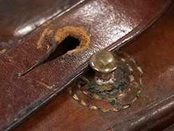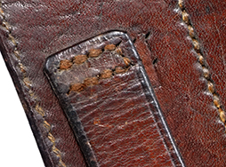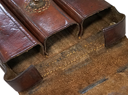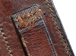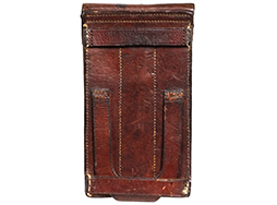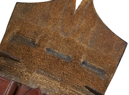 - アイテム説明MP34 マガジン・パウチです。 茶革製でマガジンを3本収納可能です。 刻印やスタンプ等は見られません。 パウチ表面には擦れや傷が見られますが、大きな破れ等の破損は見られず、革生地は艶のある柔らかい状態が保たれています。 背面のベルト・ループの縫い糸に一部解れが見られますが、現状分離することもなくしっかりと取り付けられています。 ベルトループの縫い糸のみ他の箇所とは異なる色の糸が使用されており、パウチ裏面の下穴からややずれて縫い付けられていることから、縫い直しの可能性があります。 フラップの裏側には収納していたマガジンのボトムと接触した痕が付いています。 真鍮製のギボシ金具も健在で、緑青錆も現状見られません。 (TK)