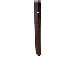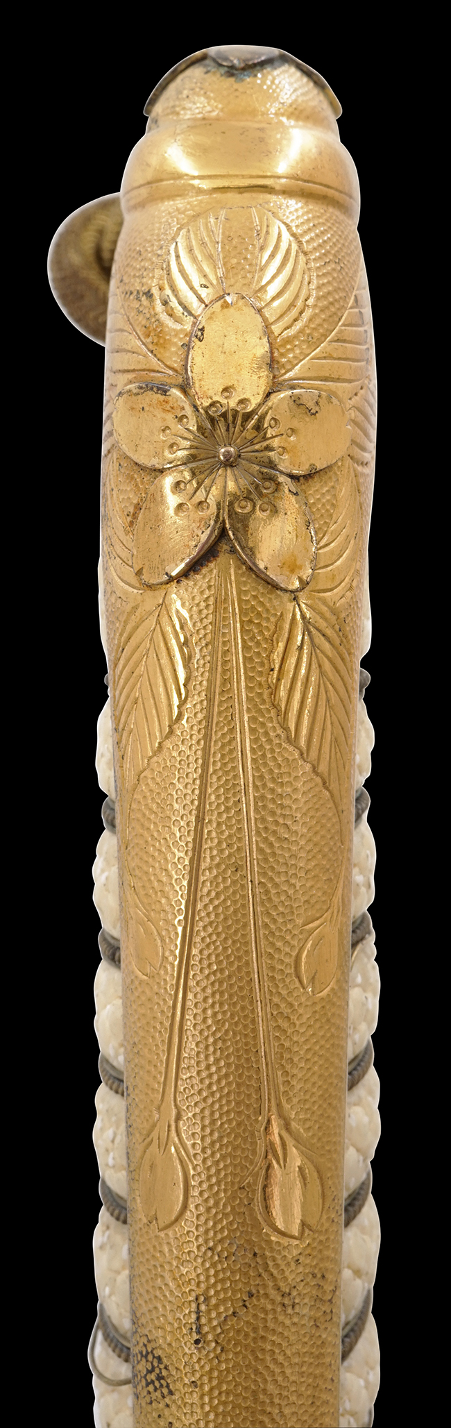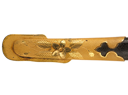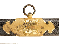 鞘内部の木部(入れ子鞘)は割れや破損も見られず、胴輪(鞘口金)の取り付けにガタつきもありません。 鞘外装は僅かに漆の擦れや一カ所浅い凹みが見られますが、全体的には光沢のある研出し漆と美しい鮫革の模様が健在です。 鞘金物には経年に伴う若干の黒ずみが見られますが、大部分でオリジナルの鍍金仕上げが残っています。 佩鐶に大きな歪みは見られません。