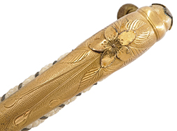 本品は抜刀した状態で刀身取り付けにガタつきはなく、しっかりとした状態が保たれています。 鍔(護拳)の取り付けにもガタつき、隙間はありません。 折りたたみ刀身止錠蓋は歯切れよくロックが掛かり、ヒンジの動きも大変スムーズです。 柄巻の鮫革にはごく僅かな粒の抜けが見られるものの、全体的に汚れは少なく、その他割れやヒビなどの破損も見られません。 金線(太1本、細2本)には一部に切れや緩みが見られるため、金線を抑えている背金部分は取り外されないほうが良いと思われます。 目釘は黒牛角製で、片側に破損が見られます。 (本品の希少性やオリジナル性を鑑み、弊社では金線の補修、目釘の交換は行っておりません)。
