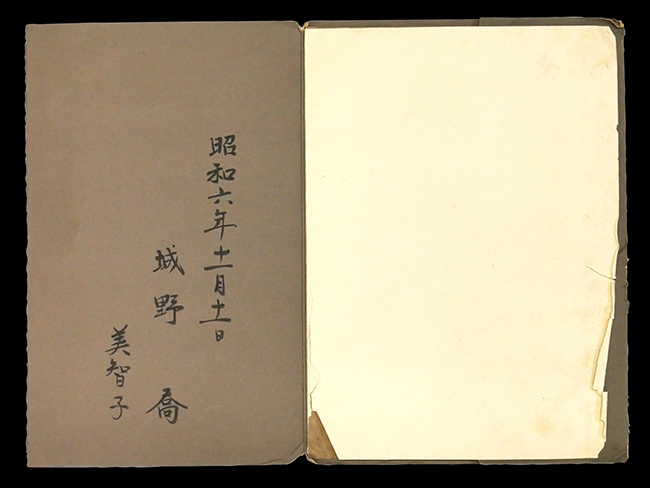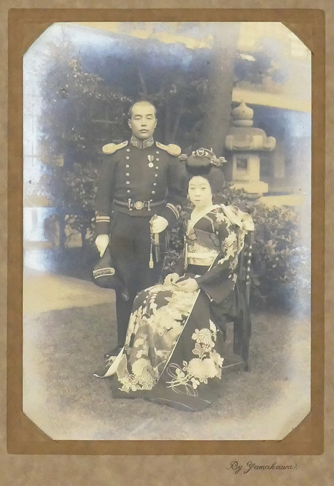 本品は元海軍大佐 城野 喬 (じょうの たかし)氏の所持品です。 本品には海軍少尉時代の婚姻ポートレート写真が付属します。 三つ折り台紙の表紙裏面に「昭和六年十一月十一日 城野喬 美智子」の記載が見られ、写真内には本品と見られる海軍旧型軍刀が写っています。 裏表紙には「東京芝区南佐久間町一ノ一 山川寫眞館」の文字が見られます。 城野 喬氏の経歴は以下の通りです。