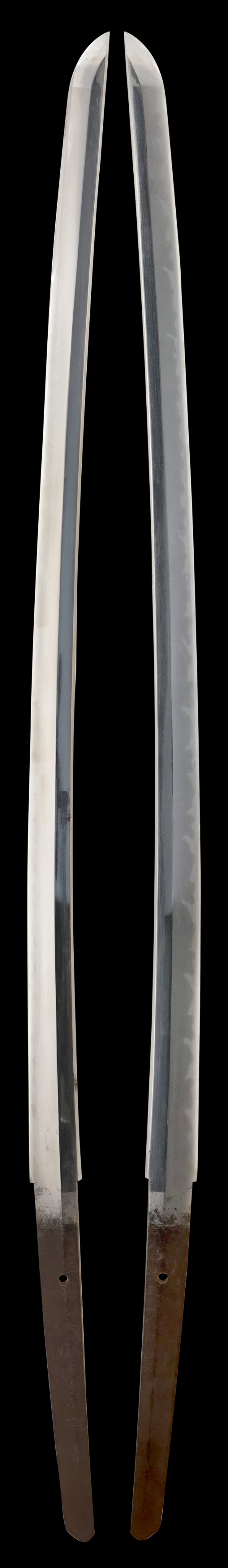 刀身は身幅があり、しっかりとした状態が保たれています。 刀身は古研ぎで、僅かに時代錆や小傷が見られますが、刃切れは無く刀身の匂い(刃紋)もしっかりと残っています。 茎は生で、羊羹色の黒錆に覆われています。 表裏銘もしっかりと確認することが出来、年紀銘の吉辰とは「吉日」と同じく良い日、めでたい日を意味します。 また、本品は明治9年以前に作刀された新々刀です。
