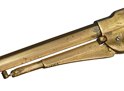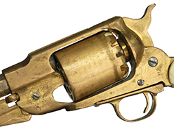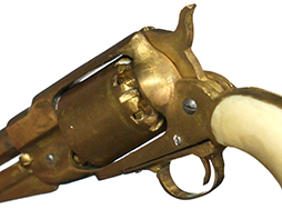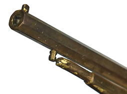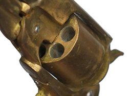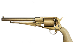 - アイテム説明レミントン ニューモデル アーミー リボルバーのミニチュアです。 真鍮製で全長は約110mm、約1/3.3スケール(厳密なスケールは約33.6%)となっています。 メーカーなどの刻印は見られず、個人製作によるものと思われます。 全体的に真鍮製で適度な時代がついています。 元々適合実包もなく、当初から射撃用として作られた品ではありません。 シリンダーのノッチやパーカッション・ニップル、内部のシリンダー・ストップ、シリンダー・ハンドは再現されていません。 ハンマー、トリガーは可動しますが、ハンマーのコッキングは出来ません。 ハンマーを起こした(押さえた)状態でシリンダーを手で回すことで回転します。 ローディング・レバーは固定されています。 象牙風のグリップ・パネルは練物製のイミテーションですが、乳白色で良い雰囲気となっています。 (TK)