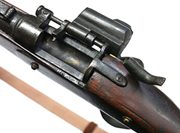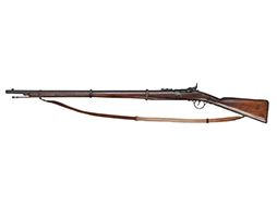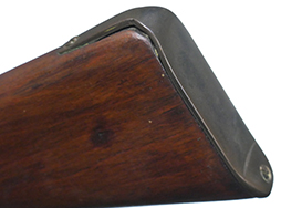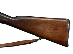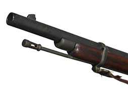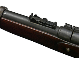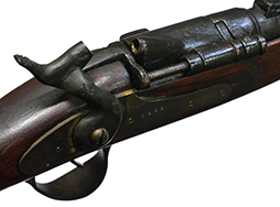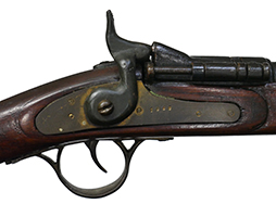 銃床は木製、バンド、機関部、銃身等の金属部分は真鍮となっています。 ハンマーはフルコックし、ブリーチは解放して薬莢の排出機能も再現されているデティールの細かい造りうとなっています。薬室は空洞ですが、銃身は閉塞されておりファイアリング・ピン部分は筒抜けとなっている撃発機構の省かれた構造となっています。合皮製のスリングは健在ですが、負荷がかかると断裂する恐れがあるため取り扱いには注意が必要です。 再度・ロックには1860の刻印が見られます。