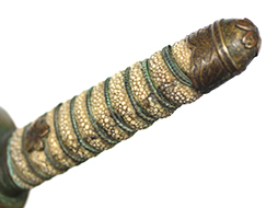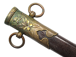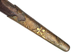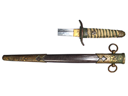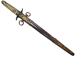 海軍士官短剣です。 外装全長約40.5cm、柄全長約10.5cm、刀身は根元から約5cmの位置で切断された合法品です。 柄巻は鮫革製で、金線には一部切れが見られます。 本品の駐爪の発条(バネ)は効いてしっかりと作動します。 鞘は目の細かい茶漆の鮫革研ぎ出となっています、所々に漆の剥落が見られますが、大きな破損などは見られません。 外装金物は時代の付いたくすみが見られますが大きな腐食等はありません、切断済みの剣先は付属しません。 (AW)