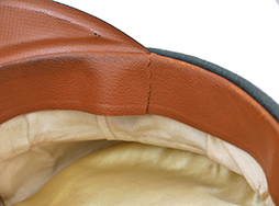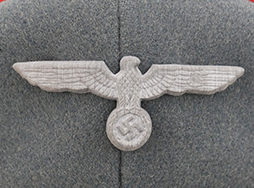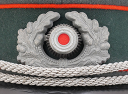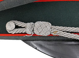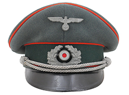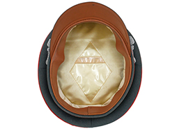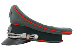 - アイテム説明第二次世界大戦中に作られたオリジナルのドイツ陸軍 砲兵士官制帽です。 アルミ製グレー艶消しの陸軍将校用国家/柏葉章と鷲章が付いていることから大戦後期の生産品と思われますが、本体生地はドスキン地です。 各部はフィールド・グレイの本体、ダーク・グリーンの鉢巻、砲兵科を示す赤のパイピングです。 全体的にほぼ未使用品に近い状態で、サイズは約56cmとなっています。 つばの部分は僅かに経年に伴うシワが見られる程度で、表面仕上げの剥落も殆ど見られません。 内側のセルロイドシールドと記名紙も健全な状態で残っています。 未使用品と思われる為、セルロイドシールドの中の紙は未記名となっています。 内装は人絹(人工レーヨン)ツイル製と思われます。 スウェット・シールドに一ヵ所の破れが見られ、チン・コードに一ヵ所極小の解れがある以外は完全な品となっています。 (MM)(TK)