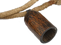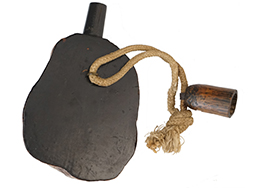 木の瘤を利用した火薬入。 瘤特有のぼこぼこした形状は握るとよく手に馴染み、見た目の面白さだけでない機能性を持っています。 裏面は平らにして黒漆塗、竹と思われる別木を使った注ぎ口も黒漆塗で仕上げてあります。 時代があると思われる紐付きです。 竹製の栓の内側には先割れの金具が残っており、元々栓は本体に紐で繋がれていたと推測できます。 注ぎ口に割れがある以外は良好な状態を保っています。
