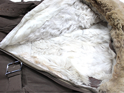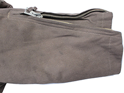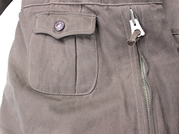 「一種航空衣袴」とも呼ばれる旧陸軍航空隊で使用された冬用の官給品ツナギ型飛行服です。 薄れて見難くなっていますが「五号、昭和十八年、本廠検定」などの検印があり、記名欄は無記入です。 腰ベルト付、前面/裾袖/ポケットなどのチャックは全て完全で開閉に問題はありません。 樹脂製ボタンも全て完全で擦り切れもありません、また襟や内側の毛皮に抜けはさほど見られません。 右内股の目立たない箇所ですが同じ生地で当時補修したと思われる、直径8cm程の円形の補修痕や一部に汚れや擦れなどが見られますが全体に良好な状態となっています。
