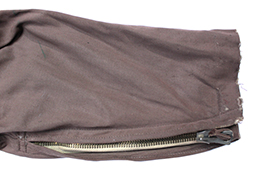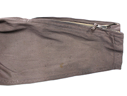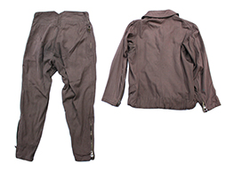 「二種航空衣袴」とも呼ばれる旧陸軍航空隊で使用された夏用の官給品上下の飛行服です。 上衣は薄れて見難くなっていますが「廣支検定、昭和十九年?、三号」と思しき検印があり、下衣には「廣支検定、昭和十九年、三号」の検印が確認できます、記名欄は上下とも無記入ですが下衣の検印の横にはマツハマと思しき名前が縫い付けられています。 腰ベルト付、袖や裾、ポケットなどのチャックは全て完全で開閉に問題はありません。 木製ボタンも全て完全です。 各部に経年による染みや擦れ解れなどが散見されますが大きな破損などは見られず全体的に良好な状態となっています。