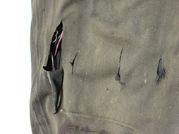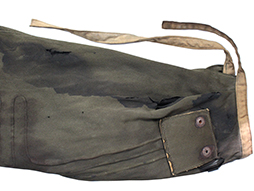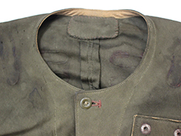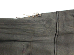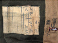 当品の「サイズは小号で昭和19年製、大支検定」の印が押されていて記名欄に記載はありません、他に納品業者(東?第二)や検査者の印の他に四角に鋼の印も確認できます。 各部に褪色や汚れ、錆、裂け等の経年感は見られるものの大きな破損は見られません。 また18年頃の電熱服とは異なり袖などの細部の形状が異ったりボタンが樹脂製からアルミ製に変わったりしています。 前面や裾袖などのアルミ製ボタンは揃っており開閉に問題はありません。 電熱手袋や電熱足袋に接続すると思われる配線のカバーのスナップボタンの一部に錆や欠けが見られますが裾足紐は完全です。 コンセントは欠損しています。