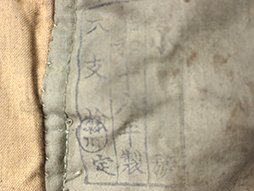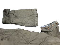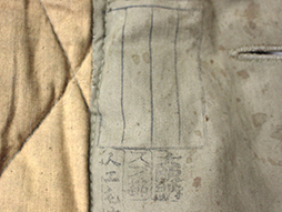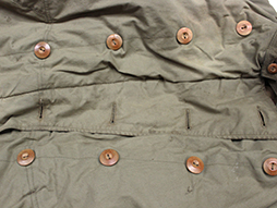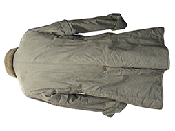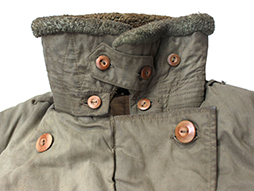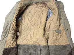 下士官兵用防寒外套と呼ばれ、北満などの厳冬地で日本陸軍の下士官や兵士が着用しました。 薄れて若干見難くなっていますが「小号、昭和十八年、大支検定」の検印があり、記名欄は無記入です、また他にスフ綿、人工毛皮製などの印も確認出来ます。 両袖が着脱できるという興味深い構造をしています。 各部の木製ボタンも良好な状態ですが後ろ裾のボタンが一つ欠けています、襟や内側の毛皮に抜けはさほど見られません。 生地や毛皮部分には経年によるシミ、汚れや擦れなどが見られますが全体にしっかりとした状態となっています。