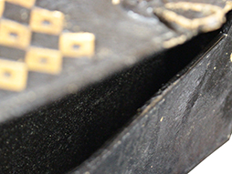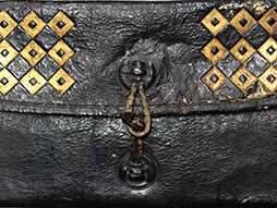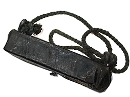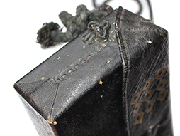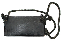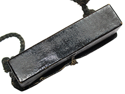 蓋の左右に「繋ギ九ツ目紋」を金箔で押した、革製黒漆塗の胴乱です。 背面の環に肩掛け用の時代麻紐が取り付けられています。