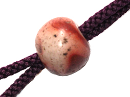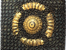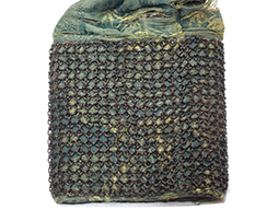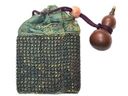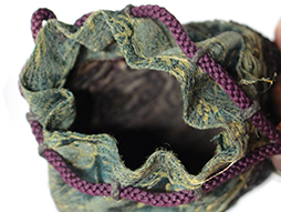 巾着型弾袋本体は布製で、胴部分の外周に甲冑の籠手の肘金物部分を使った非常に珍しいもです。 胴部分は芯材、別布の裏地、底部には革を用いたしっかりとした作りです。 巾着のサイズは横約10cm、縦約11cm、厚み約3cmで布部分には痛みが見られます。 口薬入と弾袋を繋ぐ紐には赤碧玉のような緒締玉が通されています。 (AW)(MM)