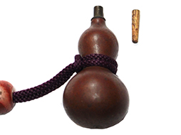 籠手巾着型弾袋と瓢箪口薬入のセットです。 瓢箪口薬入のサイズは縦約8cm、直径約3.5cmと小型で、経年感は見られるものの破損等は見受けられません。