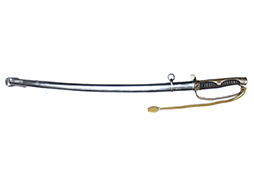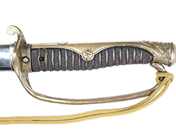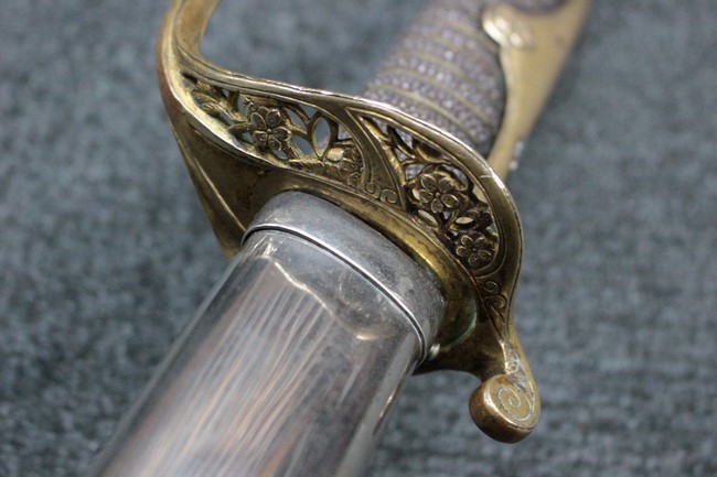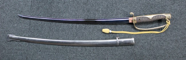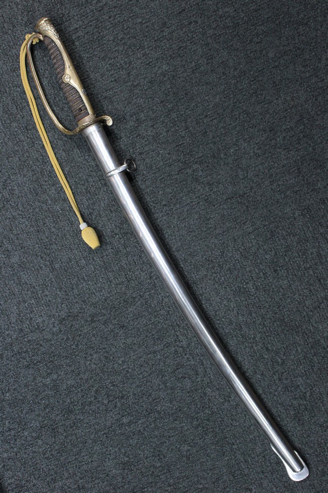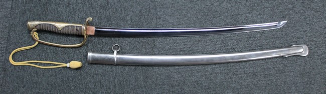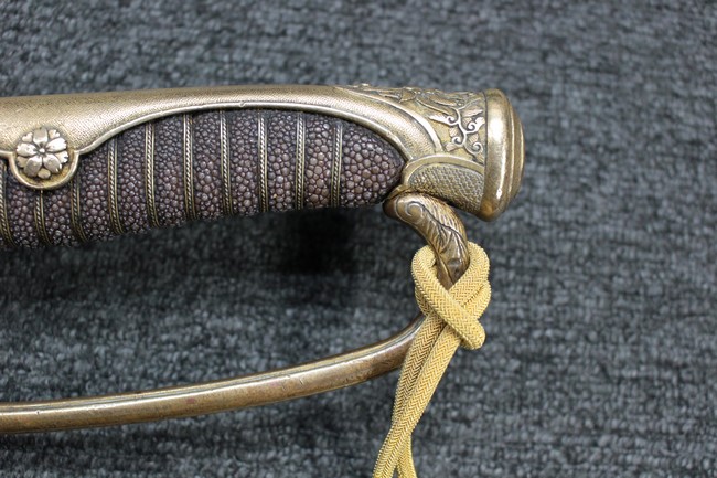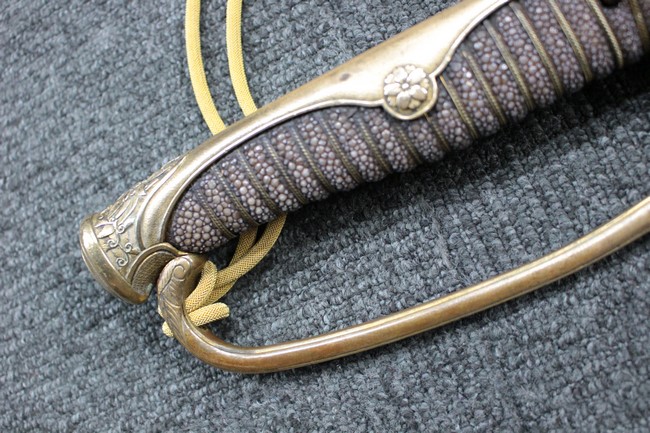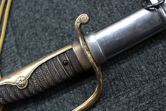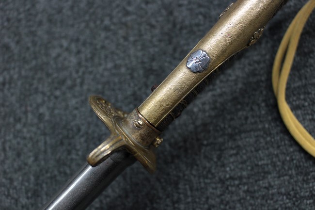 剣片喰(けんかたばみ)の家紋が入った陸軍旧型軍刀の拵に、尉官用正刀緒が付属し模造の刀身が入った品です。