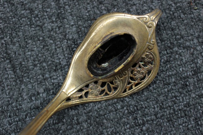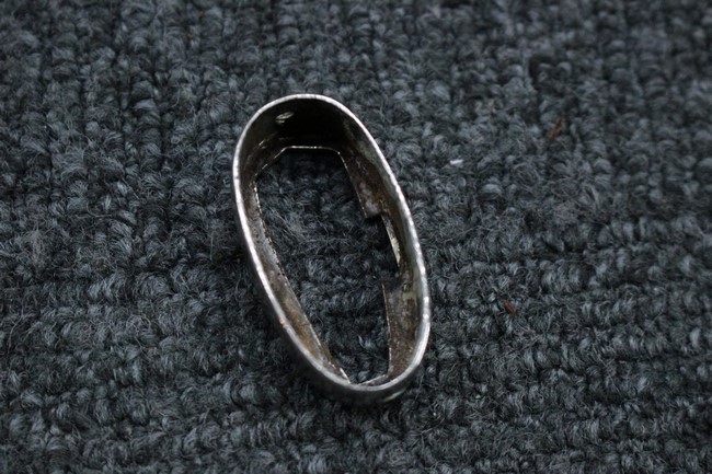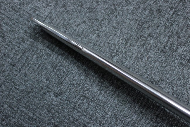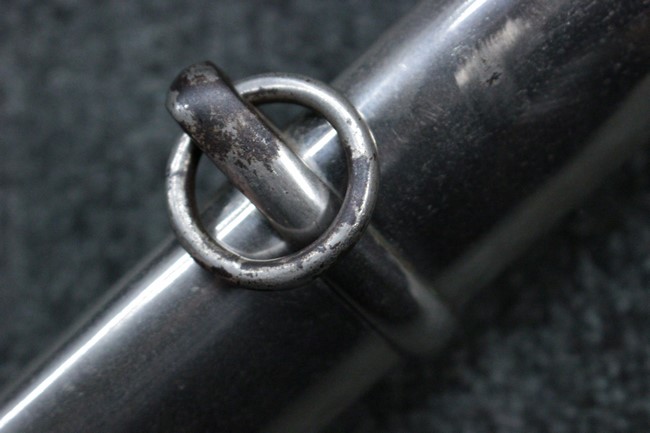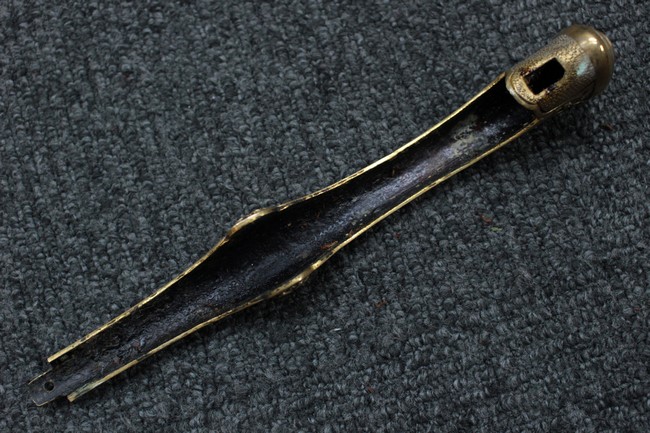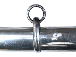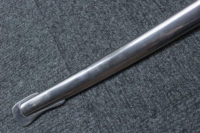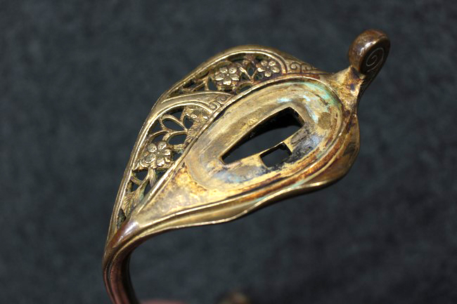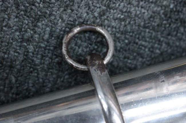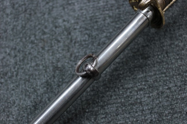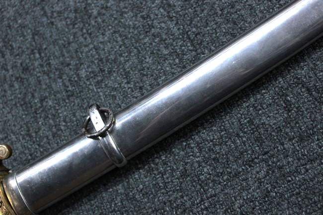 銀鍍金の施された鉄製鞘には擦れや錆などは見られますが大きな凹みや破損は見受けられず、銀鍍金は全体に良く残っています。 佩鐶にガタつきはありません。