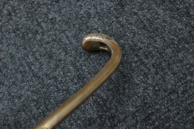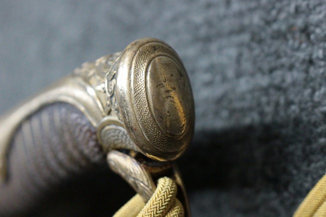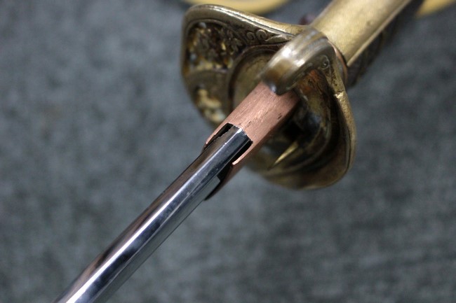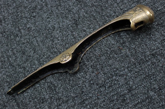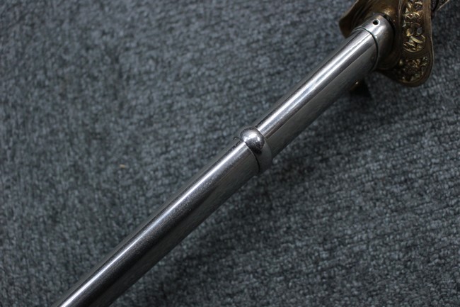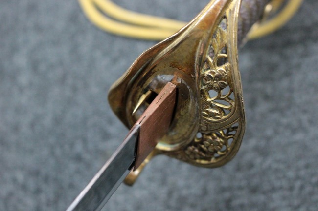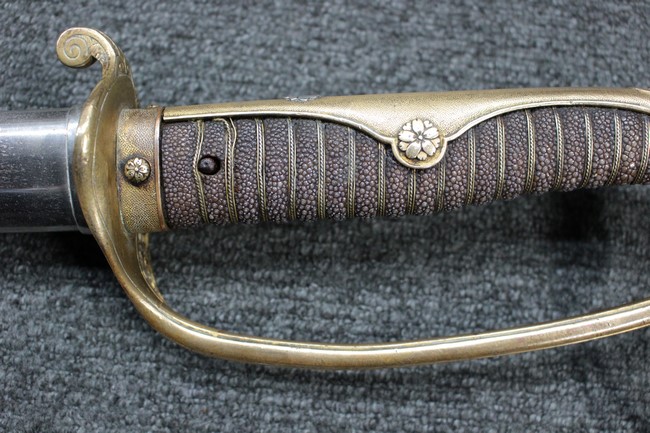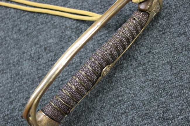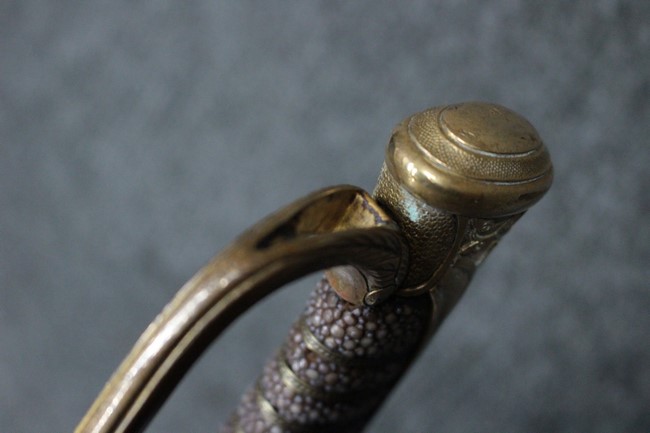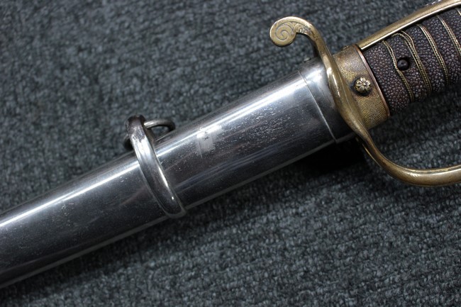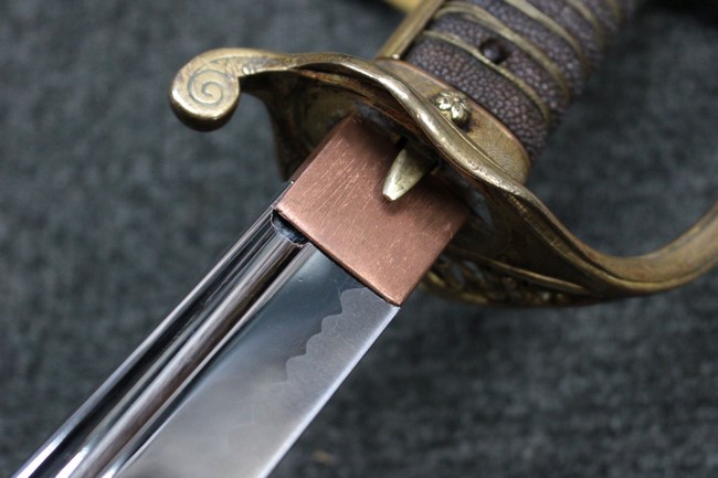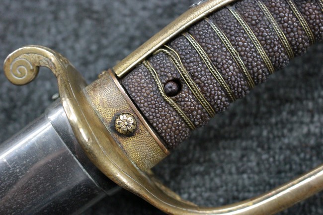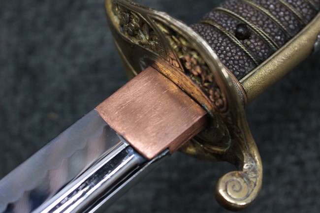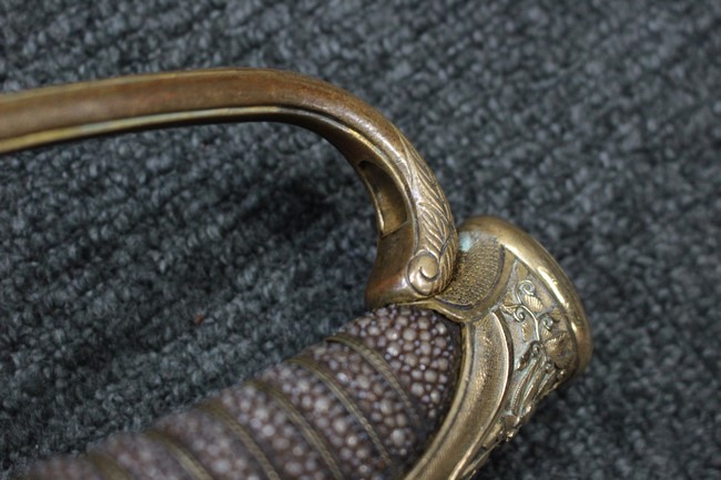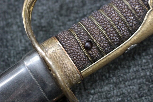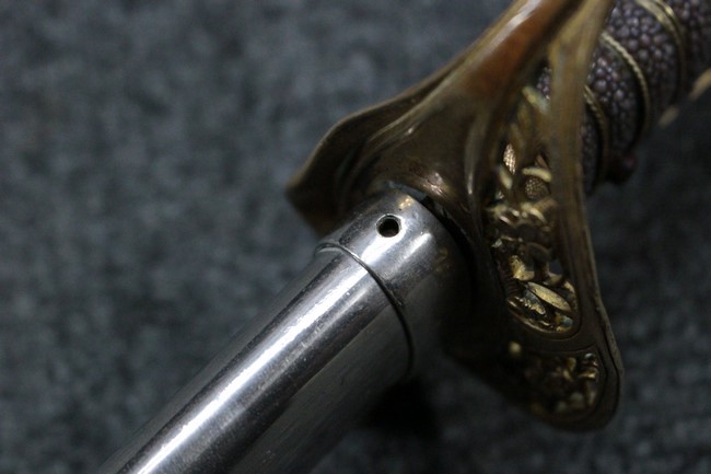 抜刀や納刀した状態において、刀身の取り付けや護拳の取り付けにいずれもガタつきが見られます。 駐爪は発条のテンションはしっかりとしており、ロックもしっかりと掛かり動作に問題はありません。 鮫革も一部に欠けなどは見られますが全体に良好な状態です。 柄内部の木部に大きな割れや欠けは見られず、縁金具の取り付けも若干のガタつきは見られますが問題はありません。