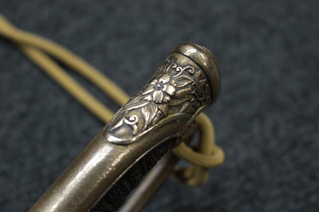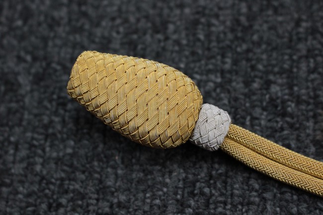 付属の金モール正刀緒にはくすみなど経年感が見られますが、大きな汚れや破損は見受けられず良好な状態です。 本品には刃渡り約65cmの合法非鉄金属製模造刀身が入っております。 模造刀身は一部に僅か小傷が見られますが良好な状態です。