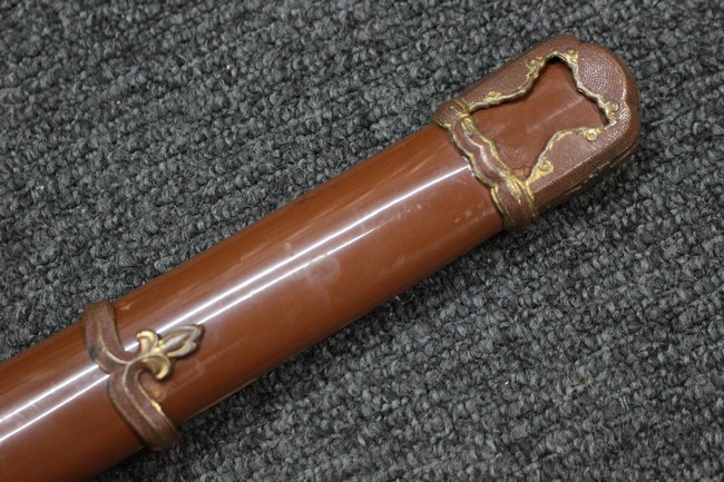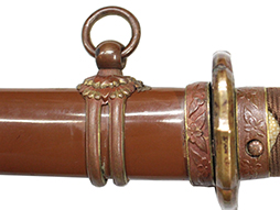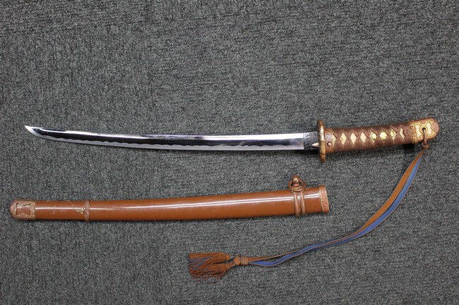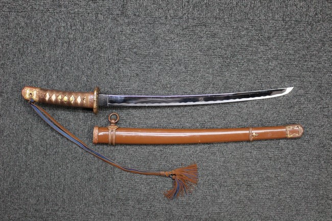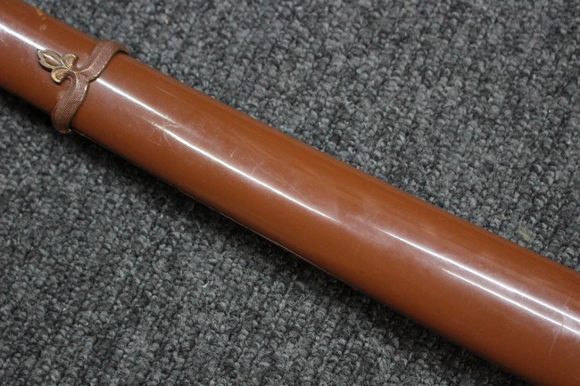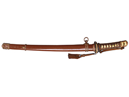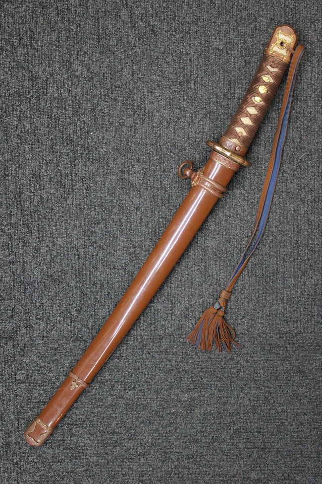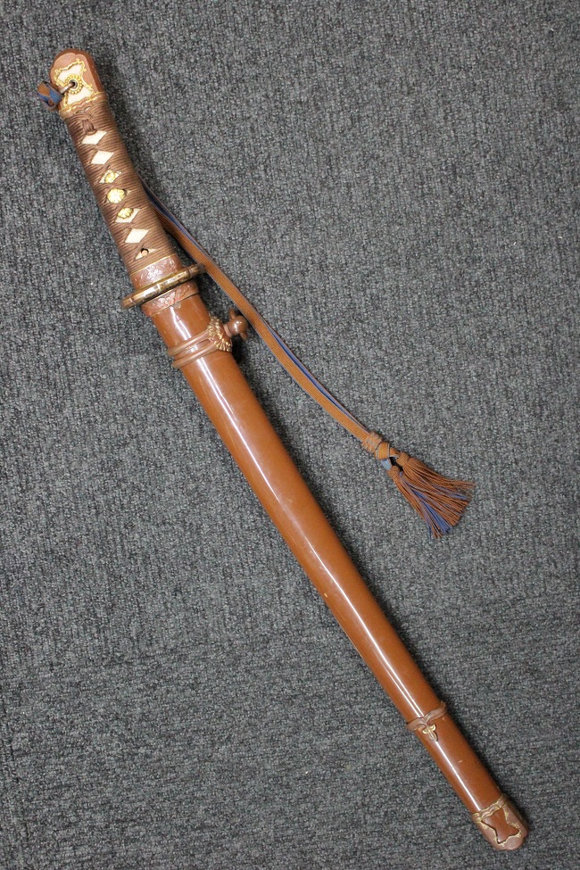 九八式軍刀の中でも大変珍しい陸軍搭乗員用の短寸軍刀です。 短寸軍刀は航空兵や戦車兵などの戦闘空間が狭い搭乗員達が使用しましたので、短寸軍刀は通称「搭乗員軍刀」と呼ばれるようになりました。本品は茶褐色光沢塗鞘の九八式搭乗員軍刀です。合法非鉄(真鍮)製の模造刀身が入った品です。