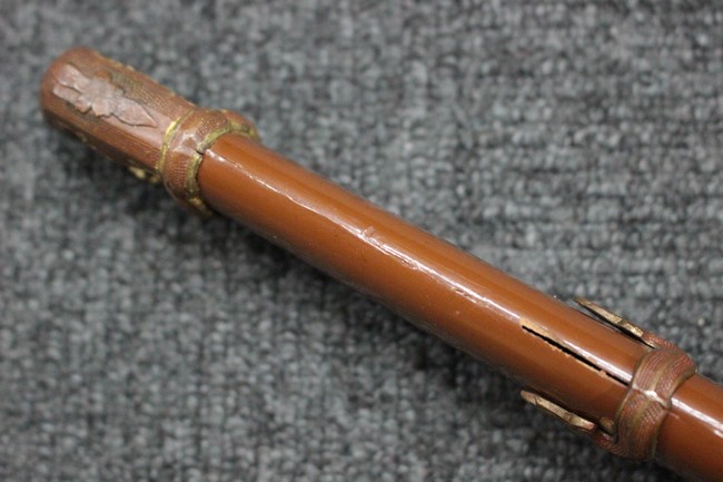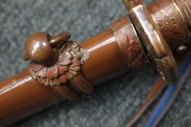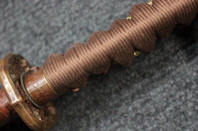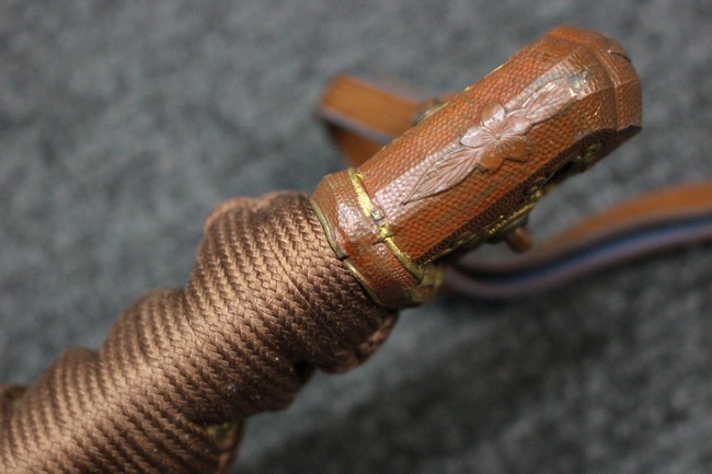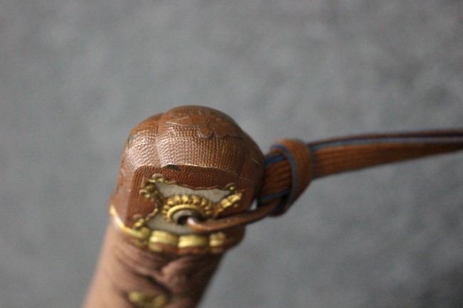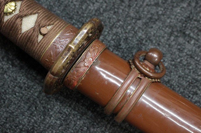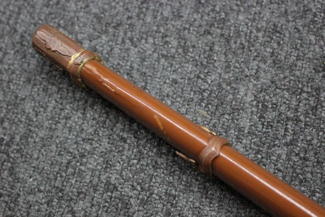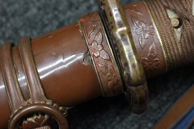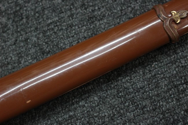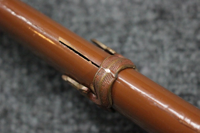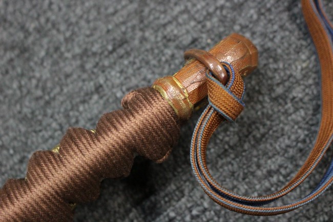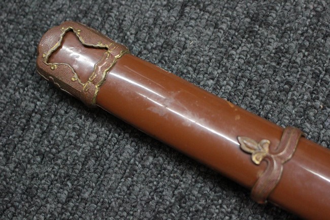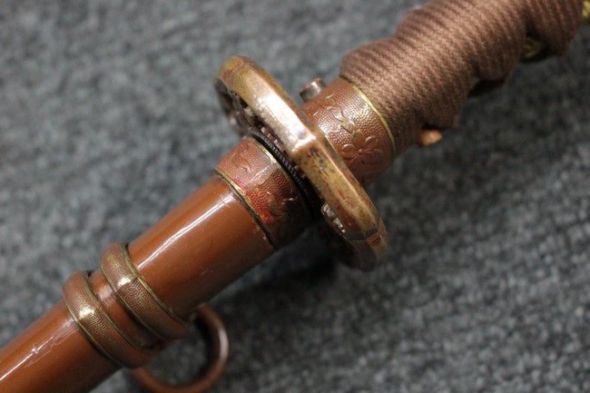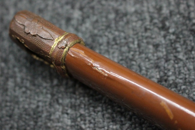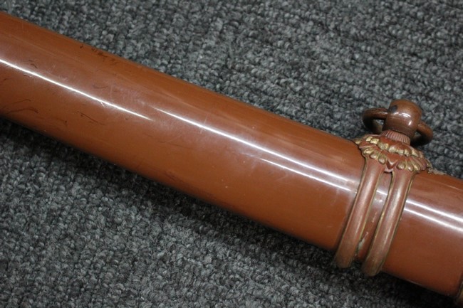 抜刀した状態の刀身の取り付けにガタつきが見られますが、概ねしっかりとした状態です。 鍔の取り付けにもややガタつきが見られます。 駐爪の動きはスムーズで発条のテンションもしっかり残っています。 しかしロックには緩さが見られ掛かり難くなっています。 はばきと入れ子鞘の抵抗も比較的少ないため不意に刀身が鞘から抜けてしまう可能性があり、取り扱いには注意が必要です。 柄巻には大きな汚れや切れ、緩みはなくしっかりとした良好な状態が保たれています。 兜金は取り付けにごく僅かなガタつきが見られますが、十分許容範囲といったところです。 本品は目釘穴が1個の仕様で木製の目釘が入っています。 柄内部は欠けも見られず、縁金具の取り付けに大きなガタつきはありません。 鞘外装はやや使用に伴う擦れや小傷が見られるものの、大きな凹みや錆は見られませんが鞘の佩鐶の前後にはパテと思われる補修痕があり佩鐶や責金にはがたつきが見られ鞘の先端部分下面には強度に問題は無いものの割れが見られます。 付属の尉官織出刀緒は経年の色褪せなどは見られますが糸に切れも見られず、全体に非常に良好な状態の品です。 外装だけとすれば高価な品なので、敢えて小さな問題点を書きましたが、全体に非常に良好な状態です。 本品は茶褐色光沢塗鞘に透かし鍔付きと通常の定寸軍刀としても魅力的で、尚且つ搭乗員用である希少価値があります。 戦後の改造品でない本歌の品でお勧めできる一振りです。