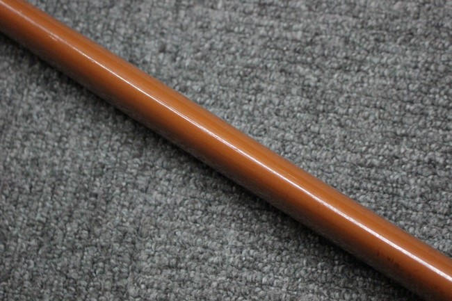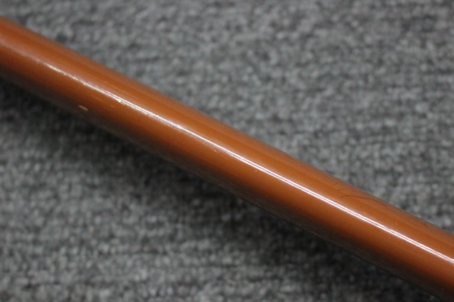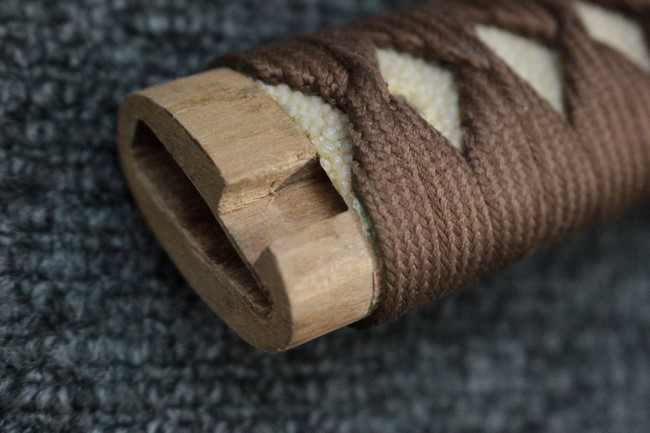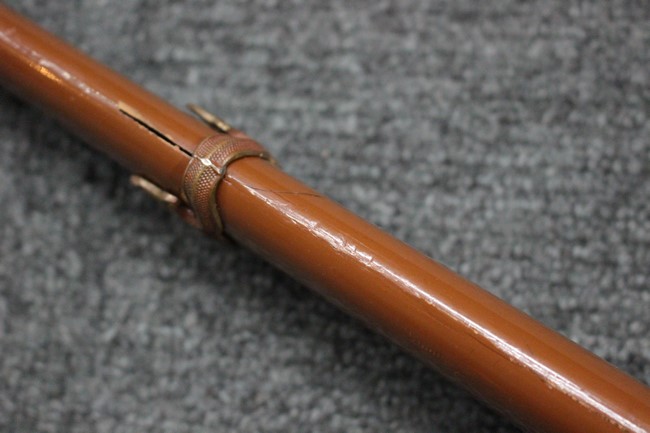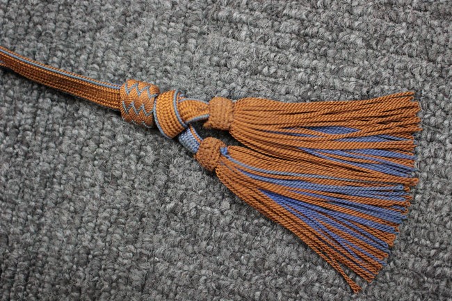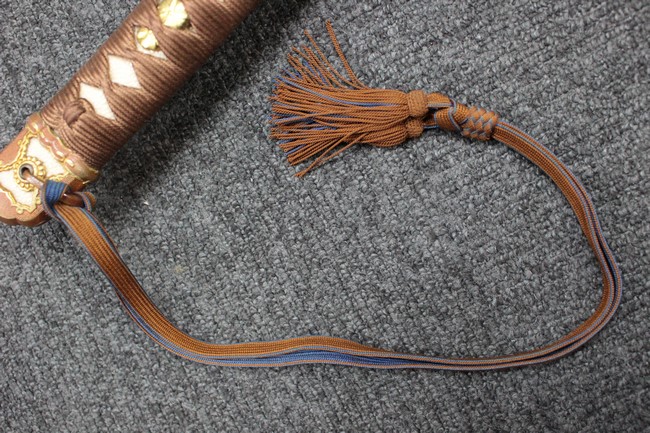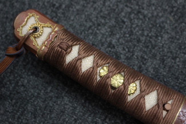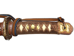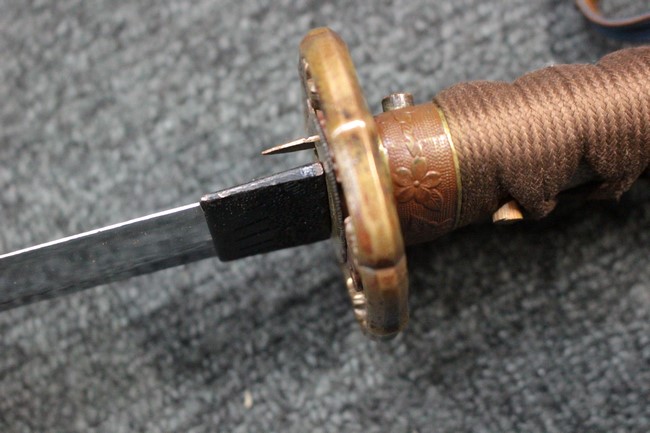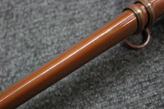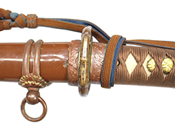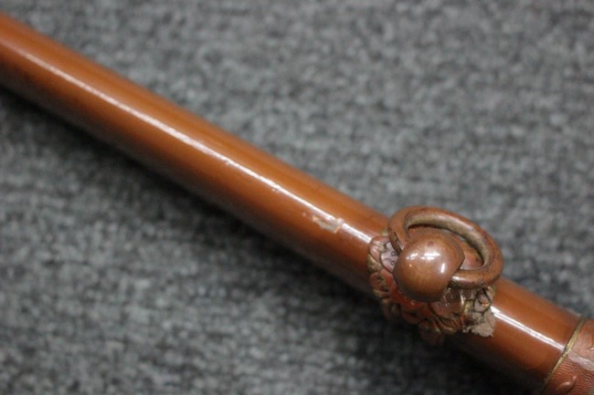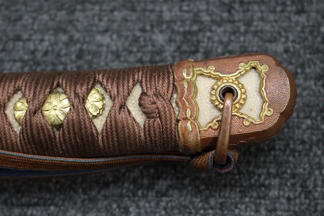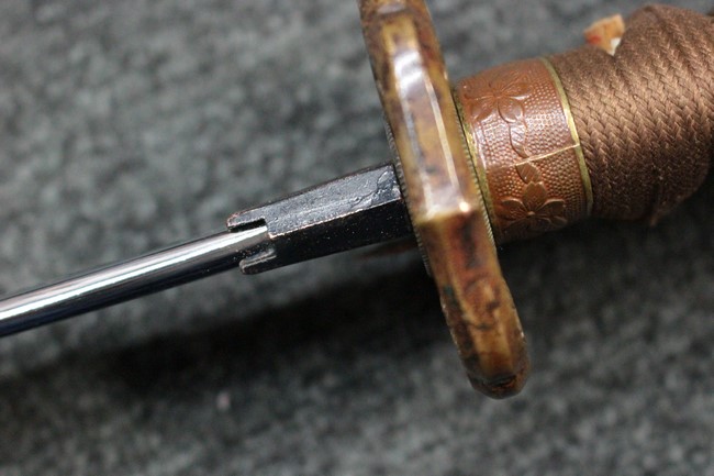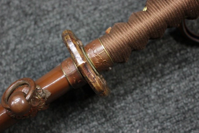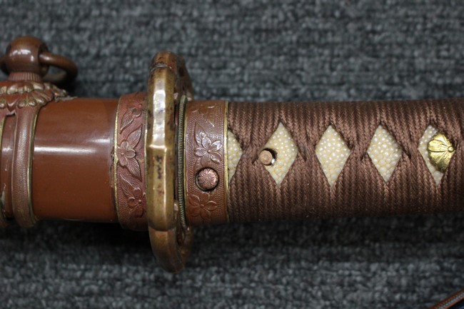 抜刀した状態の刀身の取り付けにガタつきが見られますが、概ねしっかりとした状態です。 鍔の取り付けにもややガタつきが見られます。 駐爪の動きはスムーズで発条のテンションもしっかり残っています。 しかしロックには緩さが見られ掛かり難くなっています。 はばきと入れ子鞘の抵抗も比較的少ないため不意に刀身が鞘から抜けてしまう可能性があり、取り扱いには注意が必要です。 柄巻には大きな汚れや切れ、緩みはなくしっかりとした良好な状態が保たれています。 兜金は取り付けにごく僅かなガタつきが見られますが、十分許容範囲といったところです。 本品は目釘穴が1個の仕様で木製の目釘が入っています。 柄内部は欠けも見られず、縁金具の取り付けに大きなガタつきはありません。 鞘外装はやや使用に伴う擦れや小傷が見られるものの、大きな凹みや錆は見られませんが鞘の佩鐶の前後にはパテと思われる補修痕があり佩鐶や責金にはがたつきが見られ鞘の先端部分下面には強度に問題は無いものの割れが見られます。 付属の尉官織出刀緒は経年の色褪せなどは見られますが糸に切れも見られず、全体に非常に良好な状態の品です。 外装だけとすれば高価な品なので、敢えて小さな問題点を書きましたが、全体に非常に良好な状態です。 本品は茶褐色光沢塗鞘に透かし鍔付きと通常の定寸軍刀としても魅力的で、尚且つ搭乗員用である希少価値があります。 戦後の改造品でない本歌の品でお勧めできる一振りです。