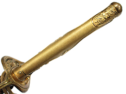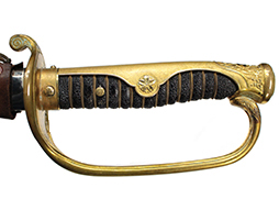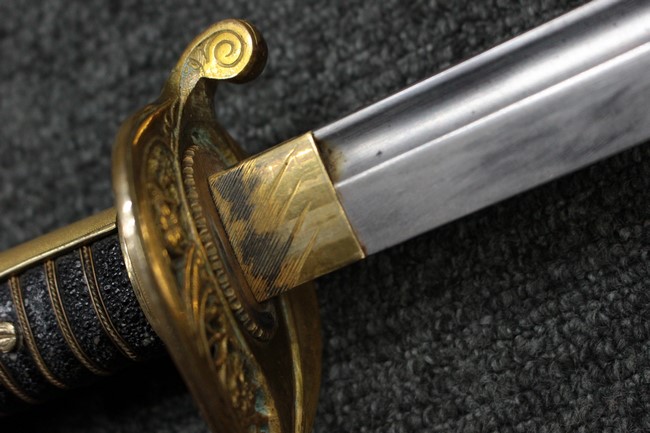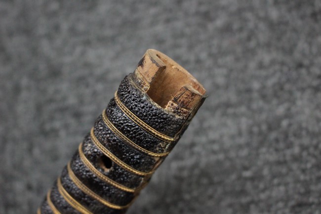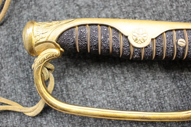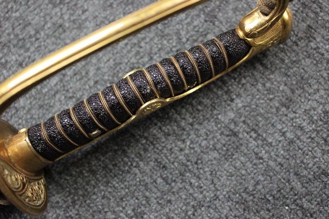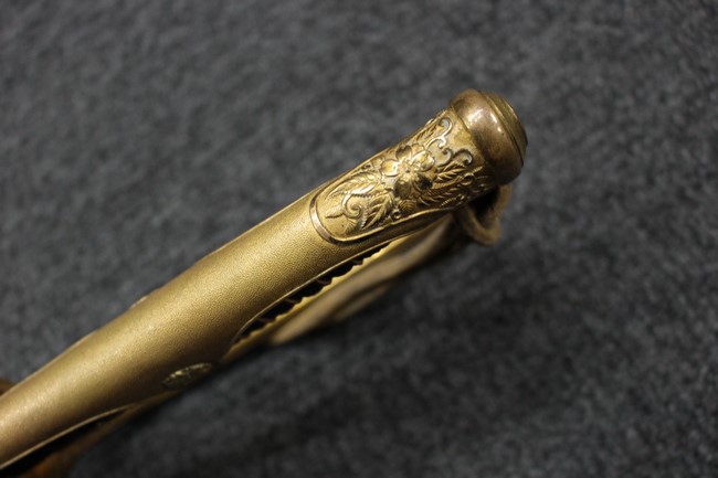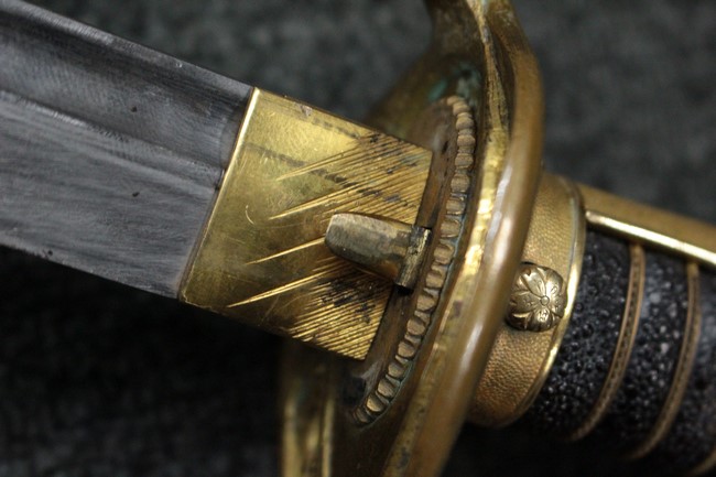 抜刀した状態の刀身の取り付けや護拳の取り付けに若干ガタつきが見られます。 駐爪は発条のテンションはしっかりとしており、ロックもしっかりと掛かり動作に問題はありません。 黒鮫革も一部に擦れなどは見られますが金線も含め大変良好な状態です。柄内部の木部に大きな割れや欠けは見られず、縁金具の取り付けにガタつきもありません。