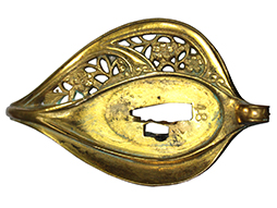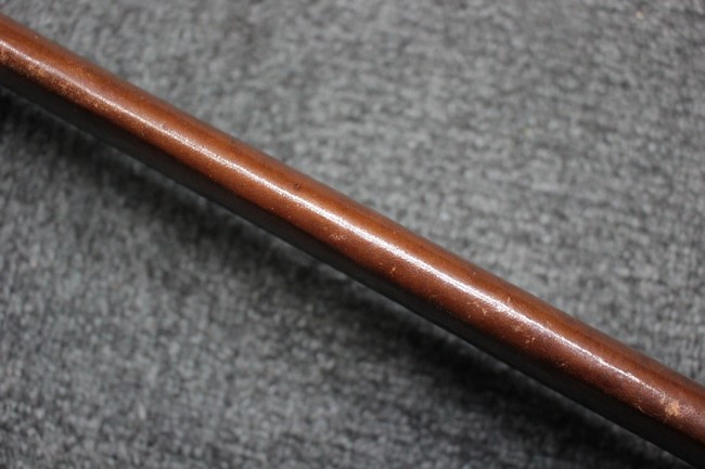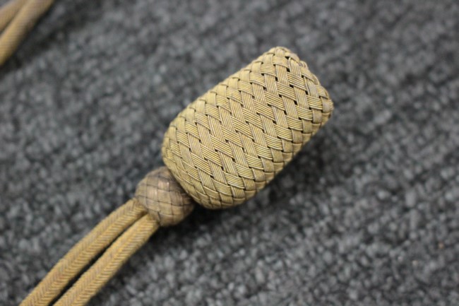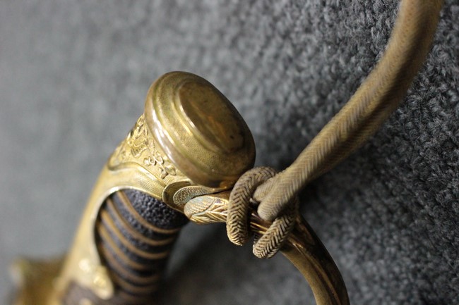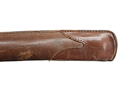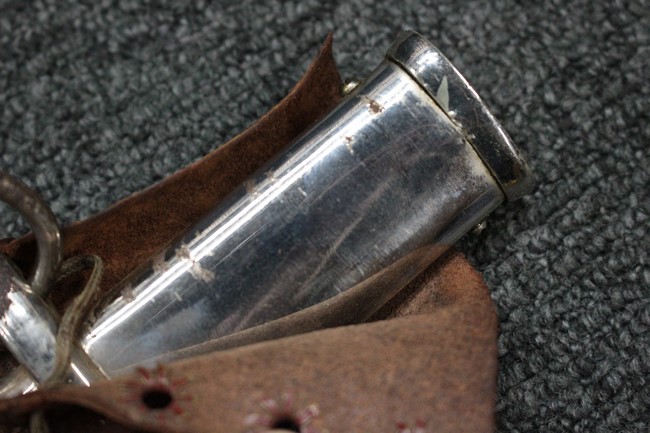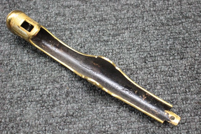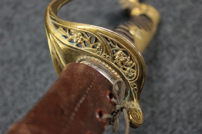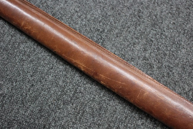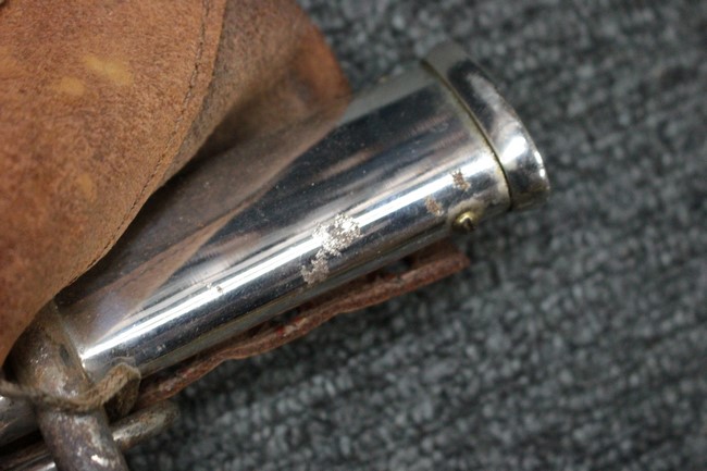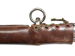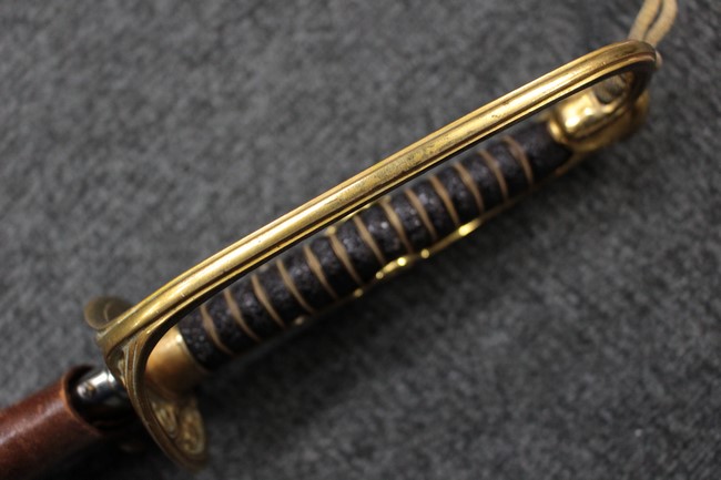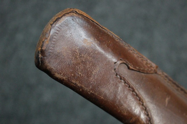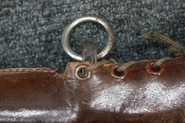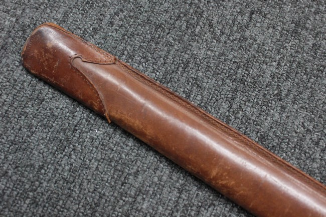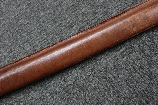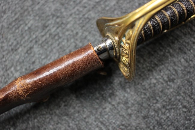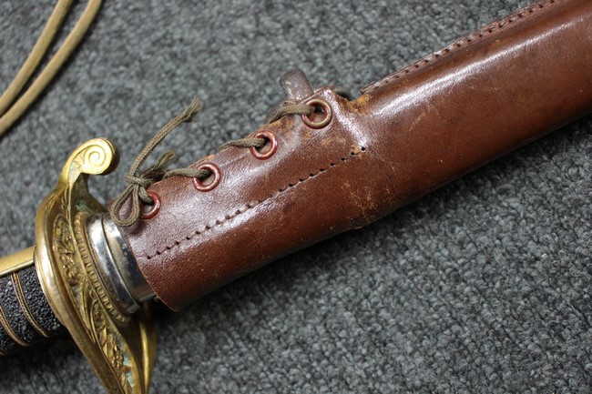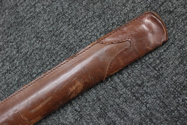 銀鍍金の施された鉄製鞘に野戦の革覆が巻かれているため状態を確認する事は出来ませんが鞘に大きな凹みや破損は無いようです、また革覆を外して確認出来る箇所の銀鍍金は良く残っています。 佩鐶にガタつきは無く、革覆も経年の擦れや収縮は見られますが状態は良好で今でも柔らかさを良く保っています。