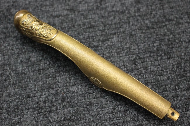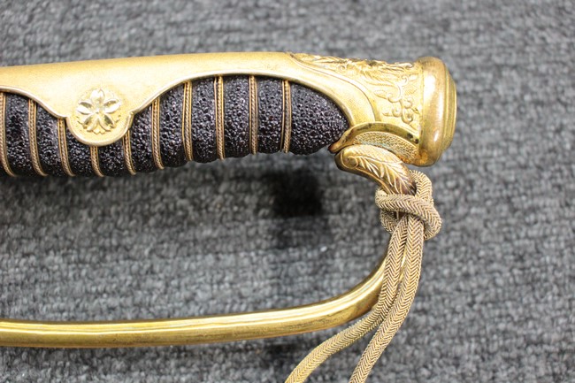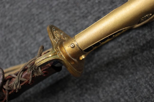 指揮刀のような雰囲気を漂わせた旧型軍刀です。 通常指揮刀には無い切羽とハバキが付いていて、彫刻なども凝っている高級溢れる品です。