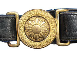 革帯の締め金具(バックル)は正規のもので、幅約30mm・全長最大約90cm(長さ調節伸縮穴有りがあり、長さの調整が可能ですが革ベルト部分の一部には硬化が見られます)。締め金具(バックル)裏当て革付。時代を考えますと全体に良好な状態ですが、経年感や解れベルト裏のフェルトの一部に虫喰い、ベルト裏の鳩目状の留め金具の一部に欠損などが見られます。(AW)- 詳細画像