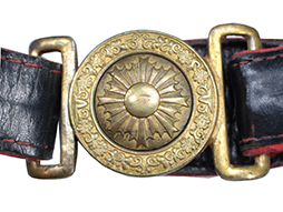 革帯の締め金具(バックル)は正規のもので、幅約30mm・全長最大約90cm(長さ調節伸縮穴有りがあり、長さの調整が可能ですが革ベルト部分の一部には硬化が見られます)。締め金具(バックル)裏当て革付。 欠品も無く時代を考えますと全体に良好な状態ですが経年による色褪せや解れ一部に虫喰いなどが見られます。(AW)- 詳細画像