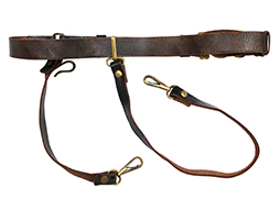 正刀帯は正装時や礼装時に正衣と併せて着用しました。この品は准士官クラスが使用したものと思われ、ベルト裏に階級を示すフェルトは貼られていません、また珍しい事に二環タイプの正刀に対応するよう下緒が2つ付属しています。