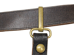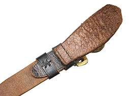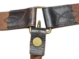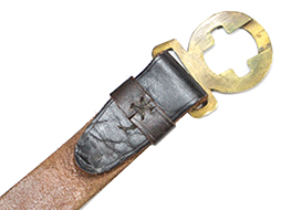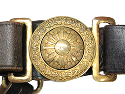 革帯の締め金具(バックル)は正規のものでベルトの幅約28mm、また他の正刀帯のような調節伸縮穴はありません、長さの調整は可能ですがそのために締め金具(バックル)が外れ易くなっています。 締め金具(バックル)裏当て革付。 欠品も無く時代を考えますと全体に良好な状態ですが経年による色褪せなどが見られます。(AW)- 詳細画像