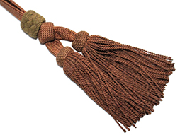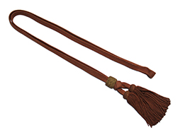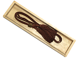 海軍士官平織刀緒です。 裏表共に若干明るめの茶色で、陸軍の刀緒と異なり階級による色分けはありませんでした。 若干の経年感は見られるものの紐部分や刀緒を束ねる環部分、房部分に解れなど見られない、程度の良い品です。 「海軍刀緒(茶)」と記載された戦後の代用と思われる桐箱入りです。 (AW)