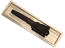 海軍士官平織刀緒です。 裏表共に濃茶色で、陸軍の刀緒と異なり階級による色分けはありませんでした。 紐部分や刀緒を束ねる環部分、房部分に装着痕や解れなど見られない、大変に状態の良い未使用と思われる品です。 「海軍刀緒(濃茶)」と記載された戦後の代用と思われる桐箱入りです。 (AW)