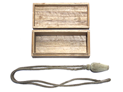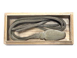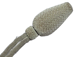 軍医や主計官などの尉官相当官用正刀緒です。 礼装時の旧型軍刀や指揮刀に取り付けました。 尉官相当官を表す銀縄目(モール)には経年による、くすみや一部解れなどは見られますが全体に程度の良い品です。 戦中のものと思われる箱根神社武運長久御守りと「明治十九年制 陸軍尉官相当官正緒」と記載された戦後の代用と思われる桐箱入りです。 (AW)