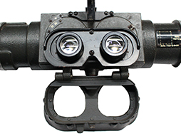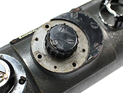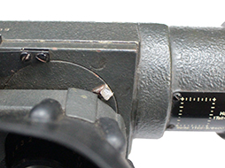 レティクル照明装置カバーは多少時代感はありますがスライド式の開閉も可能です。 接眼レンズ周囲のゴム製フード(メーカー・コード[fwq])も完全で、固定レバーを押すことによって金属製のフレームごと接眼レンズ・フードが倒れます。 筒の両側に付いた円形のクッション入り革製保護カバーも完全です。 右下にある、距離調整用ノブには機能に問題は無いものの割れが見られ、接眼部の右上の両眼の幅を調整するレバーが一部欠けています。 視界は比較的クリアに景色を視認でき、レティクルも鮮明ですが細かなチリのようなものが映り込んでいます。 正確に検証できていませんがおおよそ問題無く機能すると思われます。