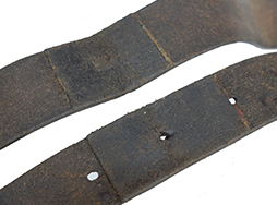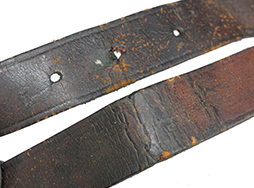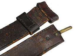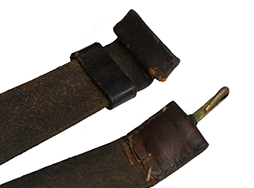 - アイテム説明ステアーマンリッカー M95 騎兵銃や短小銃に使用される革製スリングです。 スリングの穴にフック金具を通して固定するタイプです。 オーストリア軍が使用したものと同形状ですが、スタンプや打刻は見られません。 革生地には全体的に使用感、経年感が強く見られ、全体的にひび割れが見られる他、折り返し部分に破断しかかっている箇所が見られるため取り扱いにやや注意が必要です。 銃に取り付けて背負うと破断してしまう可能性がありますが、鑑賞用としての装着には問題無いものと思われます。 また、スリングには裏面の2箇所には革パッチを用いた古い補修の跡が見られます。 真鍮製のフックやリベット金具には緑青が見られますが、破損は見られません。 (TK)
