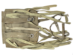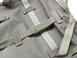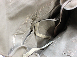 九九式背嚢は日中戦争、太平洋戦争において使用された日本軍の代表的な背嚢です。 蛸足背嚢と言うのは外套や飯盒、地下足袋、小円匙を括り付ける為の紐が多いことからきた俗称です。 今回入荷しました品は染み等があり検定印も薄れ、所有者名らしき文字も見られますが特徴的な紐に欠損もなく(戦後民間で使用されたため紐が切り取られた物も多いそうです)80年近く経過した割にあまり使用感の感じられない程度の良い品です。