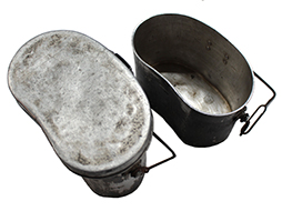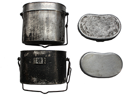 日本陸軍の九二式二重飯盒です、昭和7年に制定された新型飯盒で蓋・中蓋・外盒・内盒からなり、外盒に内盒を入れ収納しました。