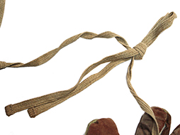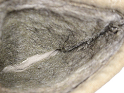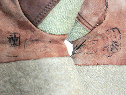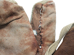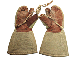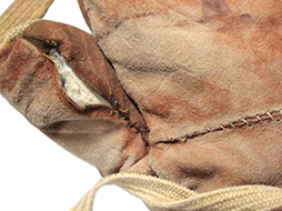 現存数の少ない日本陸軍の防寒手袋です、北部満州などの厳寒地帯用に配備されました。 生地や紐には経年による擦れ染みなどがあり、手袋の内側の革部分の継ぎ目などには補修痕が見られますが全体に大きな破損や汚れは見られません。 左右の革部分に難読ですが検印が確認できます。